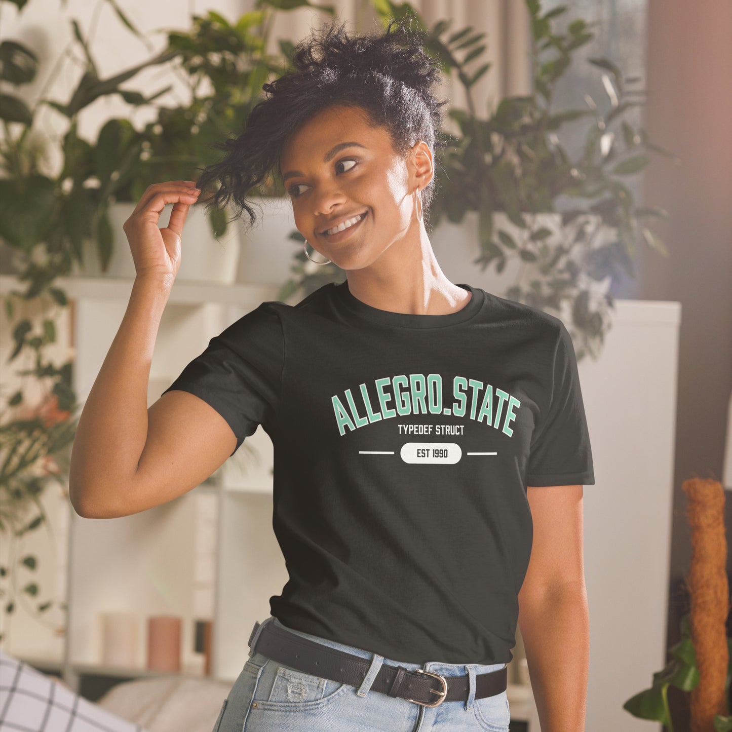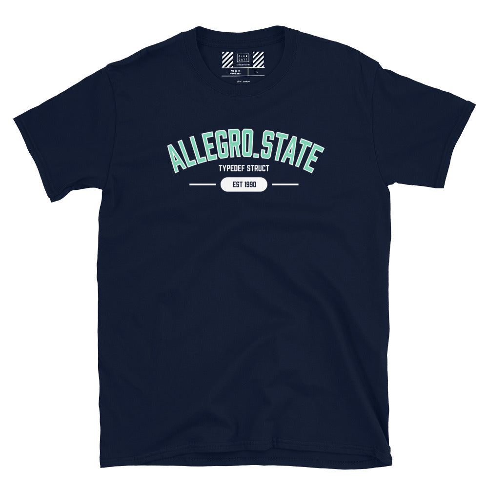 Showcase your love for game development with our ALLEGRO_STATE university-inspired t-shirt. Designed to capture the essence of academic pride and programming prowess, this shirt features collegiate-style lettering spelling out 'ALLEGRO_STATE.' Paying homage to the Allegro 5 game programming library's ALLEGRO_STATE struct, it's a witty nod to the world of game development. Available in classic navy blue or sleek black, this shirt is the perfect blend of style and sophistication. Crafted with premium materials for comfort and durability, it's ideal for both casual wear and coding sessions. Elevate your wardrobe with a touch of geek chic and let your passion for game development shine.